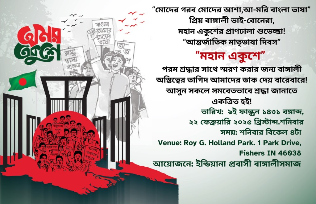Join us in observing Language Martyr’s Day on Saturday, February 22nd, 2025 from 4:00 PM at Roy G. Holland Park in Fishers, IN.